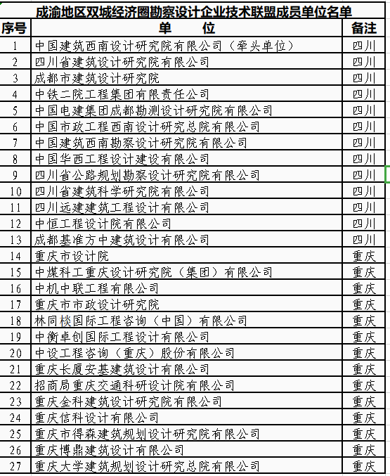 9月25日,由四川省勘察设计协会与重庆市勘察设计协会联合发起、成渝地区27家大型骨干勘察设计企业共同参与的成渝地区双城经济圈勘察设计企业技术联盟在中国建筑西南设计研究院有限公司隆重成立。四川省人民政府副省长杨洪波,中国建筑集团有限公司党组副书记、董事张兆祥,成都市人民政府副市长刘玉泉,四川省原副省长、省人大常委会原副主任黄彦蓉,中国勘察设计协会驻会副理事长王树平,四川省住房和城乡建设厅党组成员、副厅长樊晟,四川省国资委党委委员、副主任沈汝源,中建西南院党委书记、董事长、四川省勘察设计协会理事长龙卫国,中建西南院党委副书记、总经理陈勇,重庆市勘察设计协会理事长谢自强等领导共同启动了联盟成立仪式。四川省勘察设计协会常务副理事长杨光、秘书长任志宁出席会议。